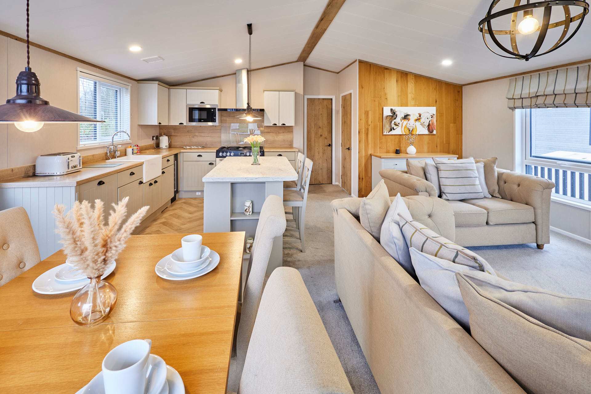 Step inside this beautifully designed lodge, where comfort and style combine to create a relaxing retreat. The lodge features two generously sized bedrooms, each thoughtfully furnished with plush beds, high-quality linens, and soft pillows to ensure a peaceful night’s sleep. Ample storage space in wardrobes and bedside tables keeps your belongings organized, making it easy to settle in for both short stays and longer visits. There are two modern bathrooms, both finished with contemporary fixtures and a clean, minimalist design. One bathroom includes a spacious shower, while the other features a bath, offering flexibility and convenience for families or small groups traveling together. Fresh towels and essential toiletries are provided, ensuring a hassle-free stay. The open-plan living area is bright, airy, and welcoming. The lounge area has comfortable sofas and armchairs, perfect for relaxing with a book, watching a movie, or spending time together as a group. Adjacent to this, a dining area with a large table invites shared meals and lively conversation. The fully equipped kitchen includes everything you need to prepare home-cooked meals or quick snacks, from a modern oven and hob to a fridge, freezer, microwave, and all essential cookware and utensils. Large windows throughout the lodge bring in natural light and provide peaceful views of the surrounding countryside. Whether you’re enjoying your morning coffee while watching the sunrise or winding down in the evening surrounded by serene scenery, the lodge offers a tranquil atmosphere that feels like a true home away from home.